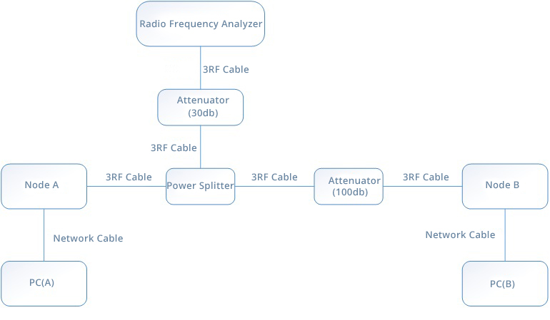 မှန်ကန်သောပုံသဏ္ဍာန်နှင့်အညီ စမ်းသပ်ပတ်ဝန်းကျင်တစ်ခုကို တည်ဆောက်ပါ။စမ်းသပ်ကိရိယာမှာ Agilent E4408B ဖြစ်သည်။Node A နှင့် node B တို့သည် စမ်းသပ်ဆဲ စက်ပစ္စည်းများဖြစ်သည်။၎င်းတို့၏ RF အင်တာဖေ့စ်များကို လေဖြတ်စက်များမှတစ်ဆင့် ချိတ်ဆက်ထားပြီး ဒေတာဖတ်ရှုရန် ပါဝါခွဲခြမ်းမှတစ်ဆင့် စမ်းသပ်ကိရိယာသို့ ချိတ်ဆက်ထားသည်။၎င်းတို့တွင် node A သည် theစက်ရုပ်ဆက်သွယ်ရေး moduleနှင့် node B သည် ဂိတ်ဝေးဆက်သွယ်ရေး မော်ဂျူးဖြစ်သည်။