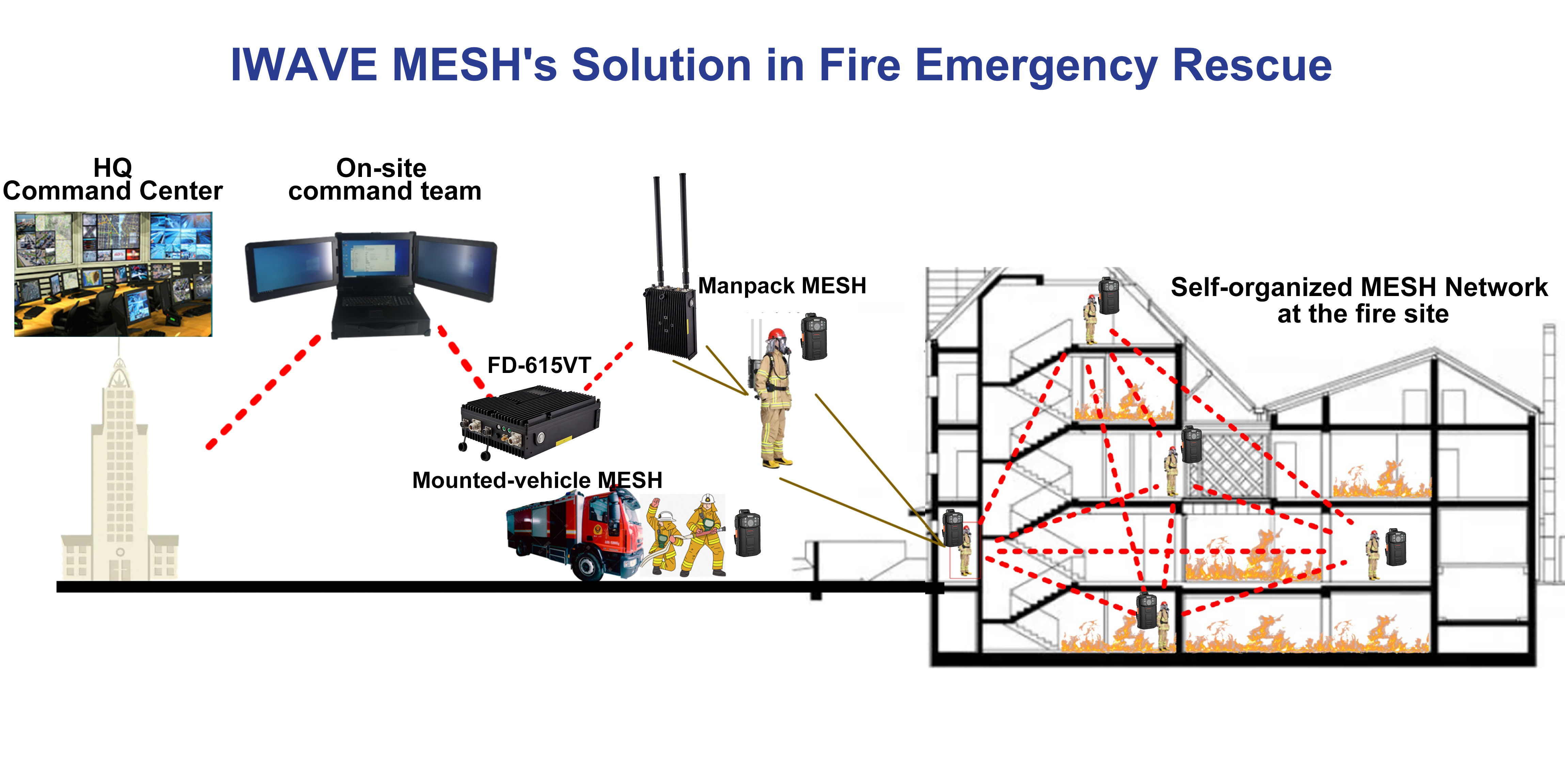 3. The front firefighters can communicate smoothly within the range of a multi-storey building through a portable, miniaturized MESH terminal.