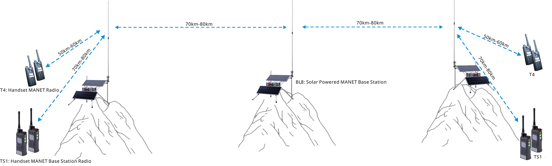 ●Stacja bazowa BL8 zasilana energią słoneczną bezprzewodowo łączy się ze wszystkimi obecnymi terminalami radiowymi MANET MESH firmy IWAVE, stacją bazową MANET, przekaźnikami radiowymi MANET, systemem dowodzenia i dyspozytorem.