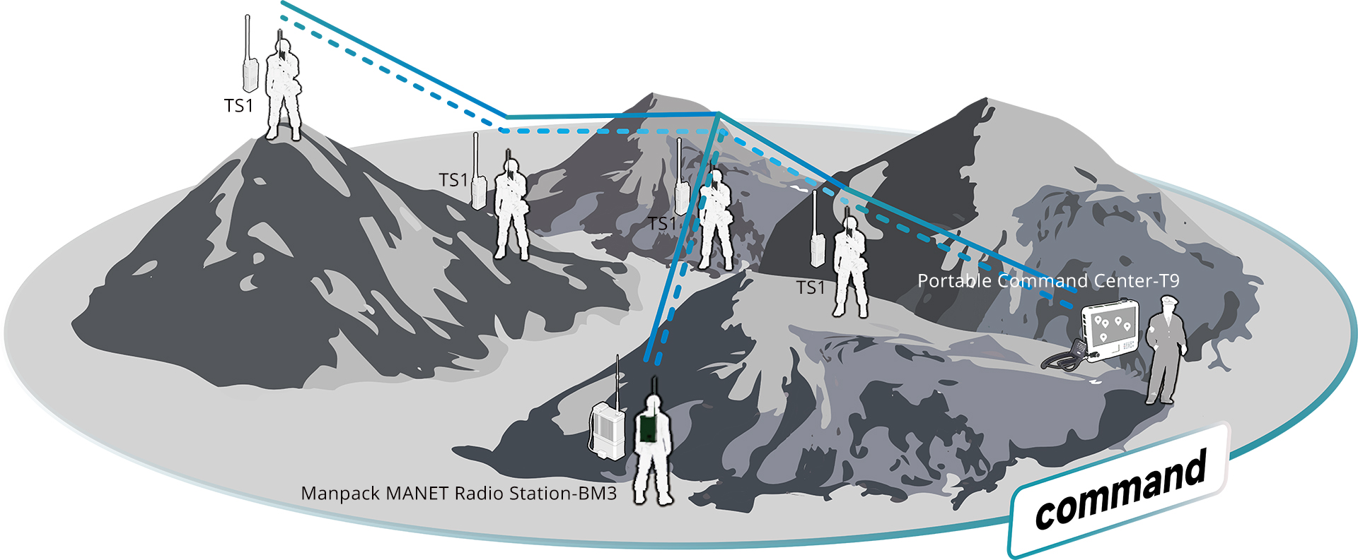 ●In an emergency, every second counts. The BM3 Ad-Hoc network radio repeater supports push-to-start for rapidly and automatically setup an independent multi-hop links mobile communication network to cover a large and NLOS mountainous field.